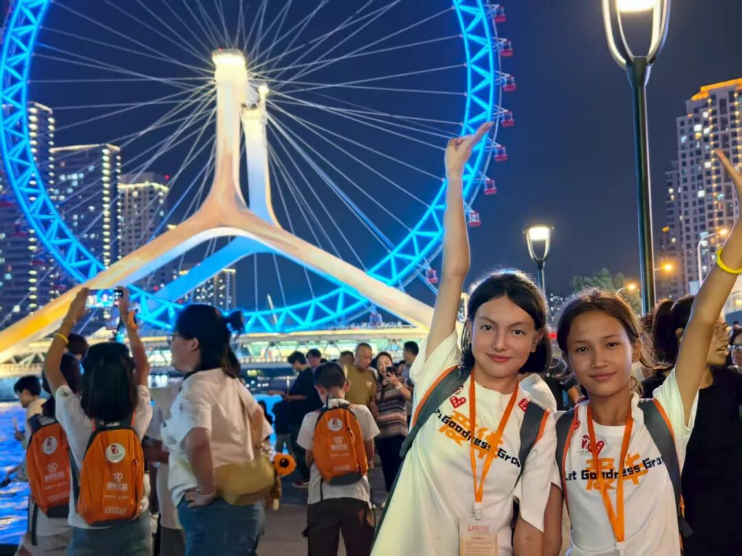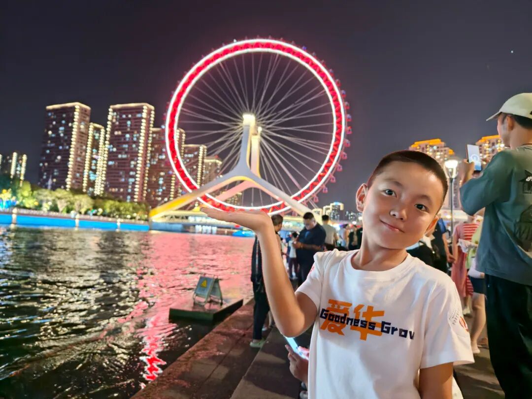 打卡天津之眼、世纪钟,登上海河游船,微风吹过,绚烂的灯光让孩子们格外兴奋。