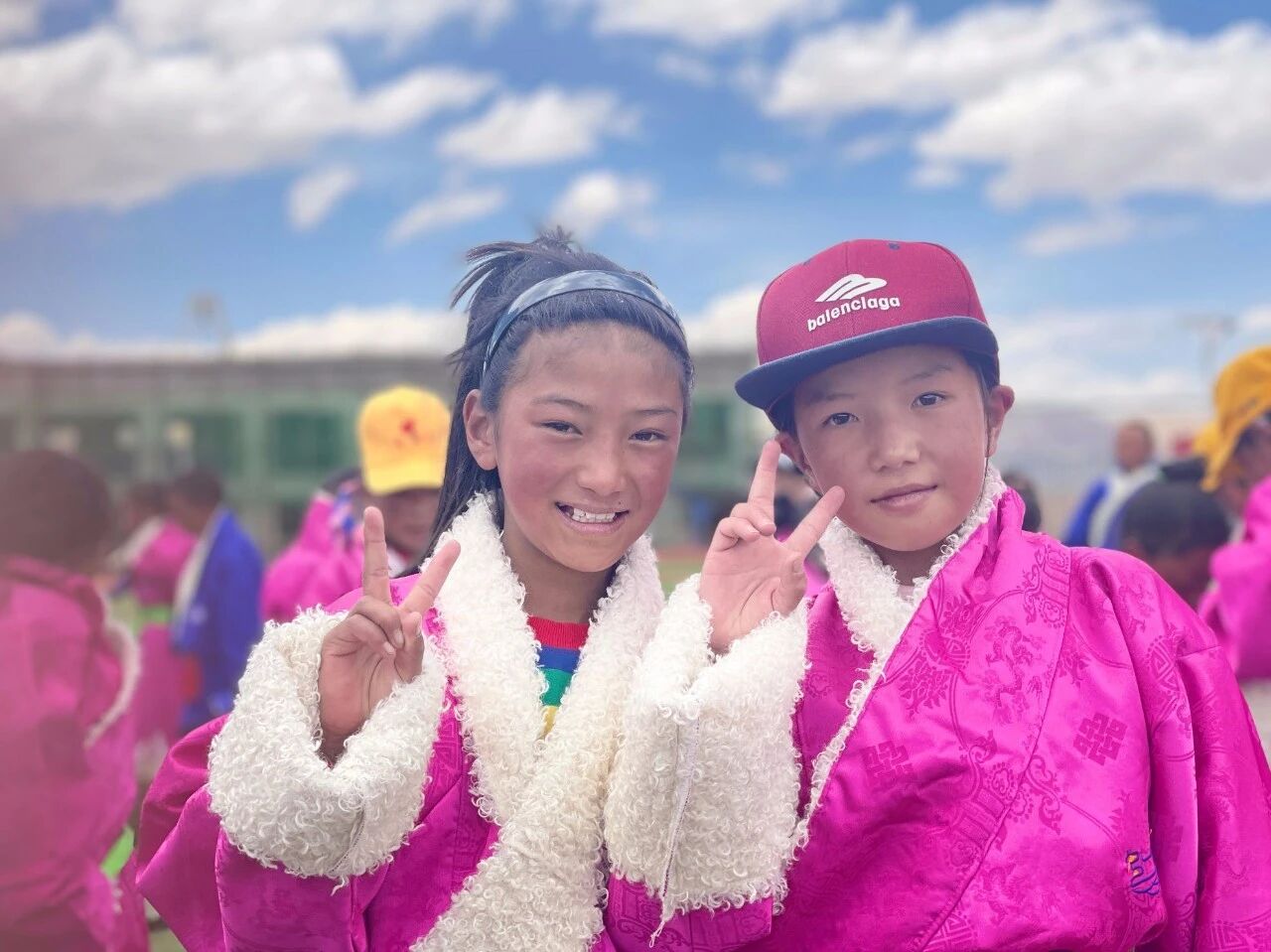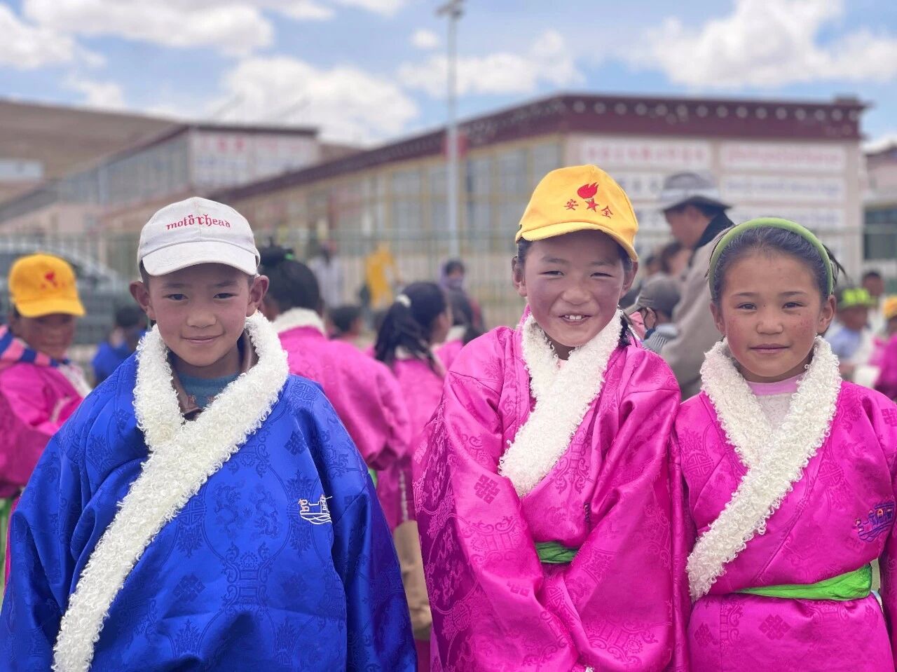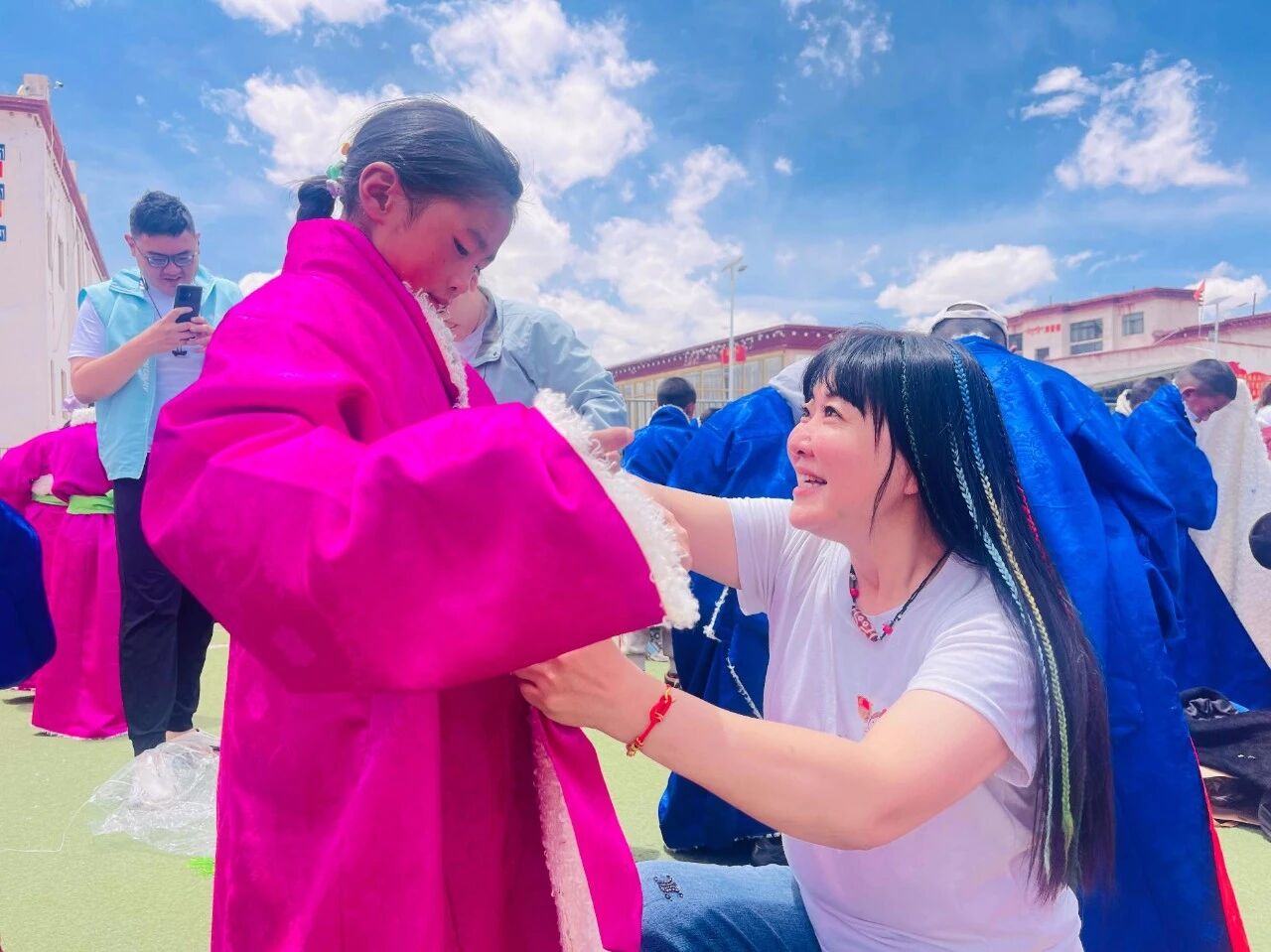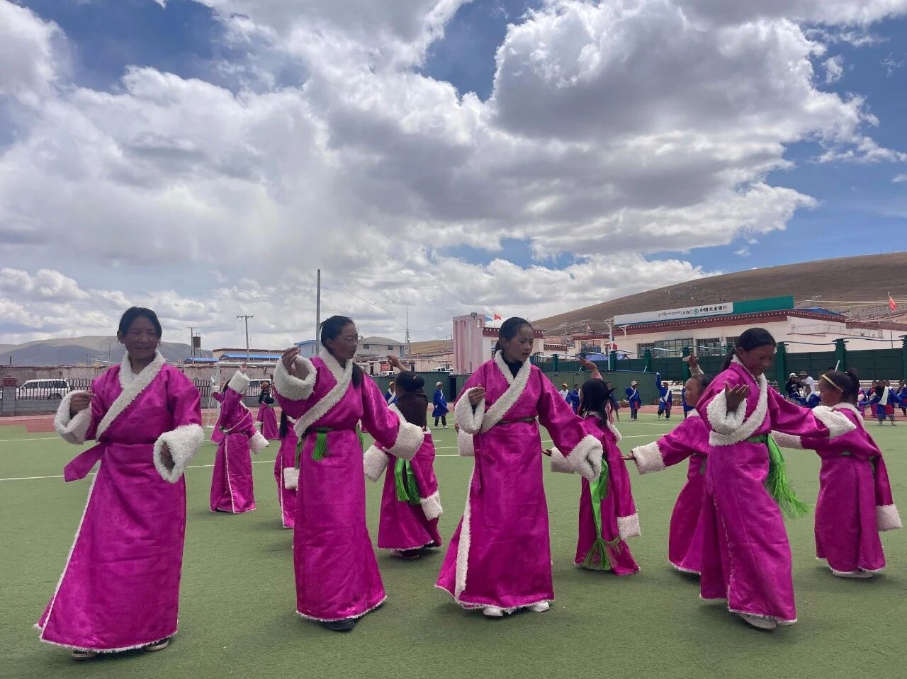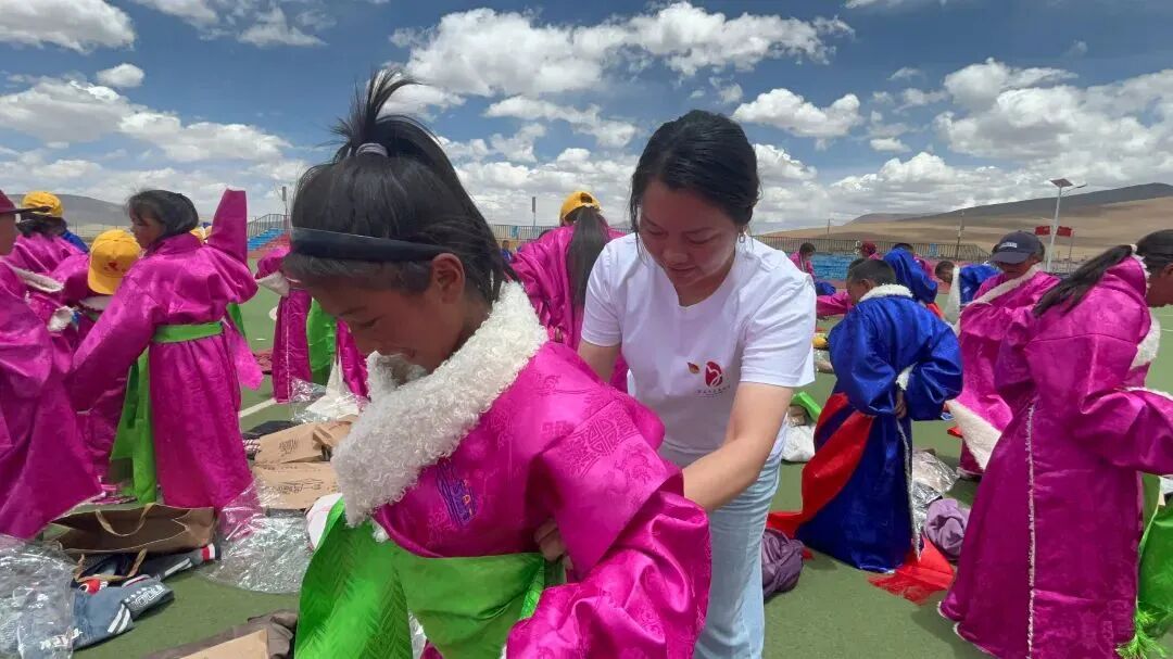 孩子们在操场上穿上了藏袍校服,鲜艳的色彩如同花儿一样在蓝天白云下绽放,他们手拉着手,围成圈,欢快的舞步,清脆的笑声,这就是高原上最动人的旋律。我们拿起手机想记录下这美好的时刻,让更多的人们都能关注这片土地,又被孩子们簇着、拉着,一起融入了舞蹈队伍。